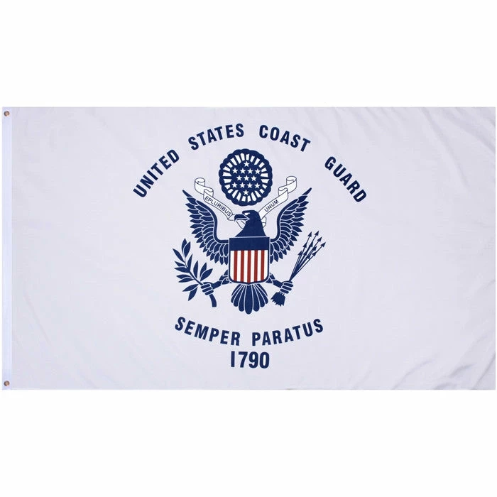 Great to use symbolically for signaling your beliefs or identification. UNITED STATES COAST GUARD SEMPER PARATUS 1790 printed on front of flag in navy blue lettering. US Army emblem aka US Army eagle pictured on front. This flag can be placed on a flag pole mounting bracket (Item# 189). US Coast guard 3′ x 5′ flag. Dimensions: 3′ x 5′ (feet).