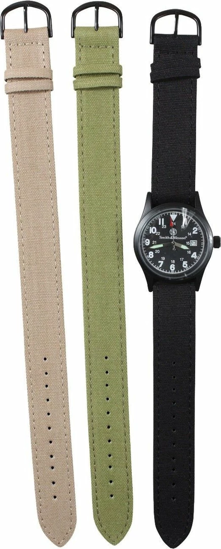 - 3 Interchangeable Heavy Duty Canvas Watch Bands: Black, Olive Drab, & Khaki